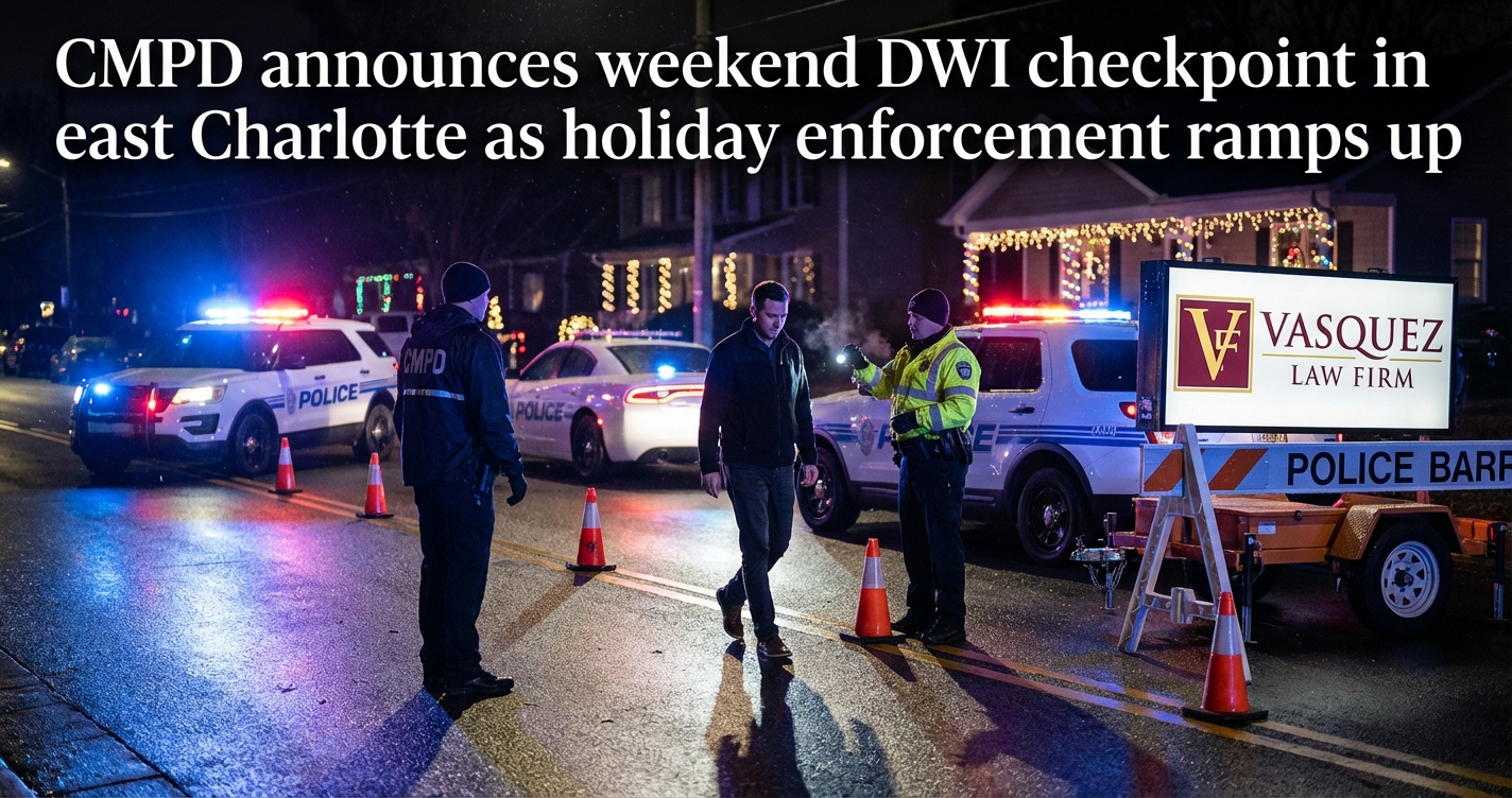 The CMPD has announced a DWI checkpoint in east Charlotte this weekend as part of a holiday enforcement campaign. Learn about your rights, options, and how Vasquez Law Firm can help you navigate traffic violations in North Carolina.