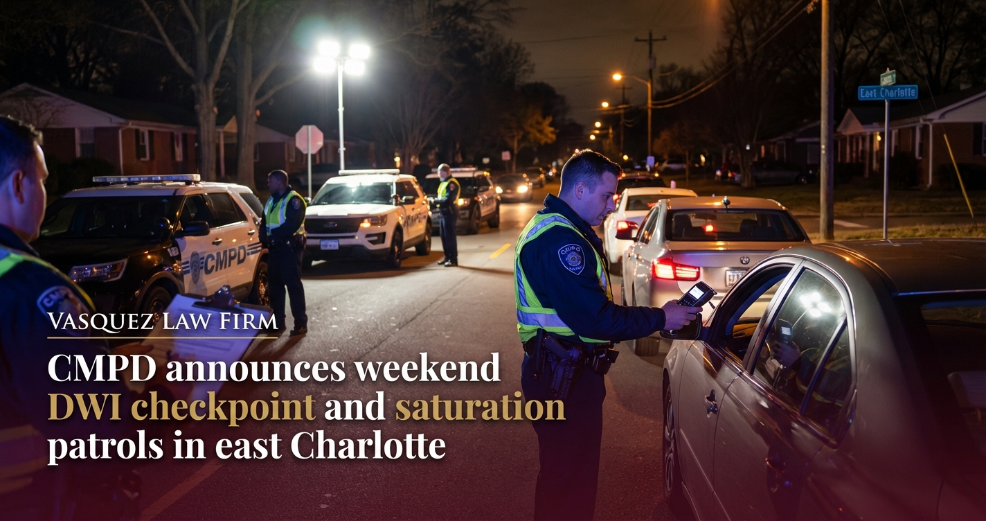 The CMPD's weekend DWI checkpoint and saturation patrols in east Charlotte signal serious implications for drivers. Learn your rights, options, and how Vasquez Law Firm can help.