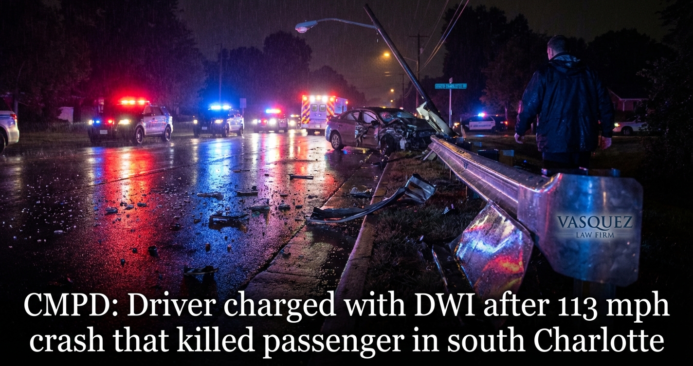 A South Charlotte driver faces serious charges after a 113 mph crash killed a passenger. Learn about the implications of DWI charges and how Vasquez Law Firm can help.