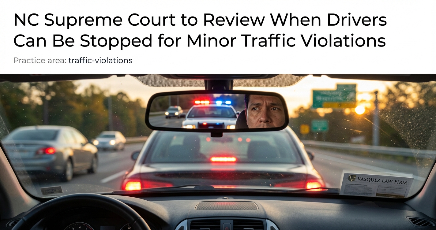 The NC Supreme Court will review a case that could redefine the standards for traffic stops for minor violations. Learn how this impacts your rights and how Vasquez Law Firm can help.